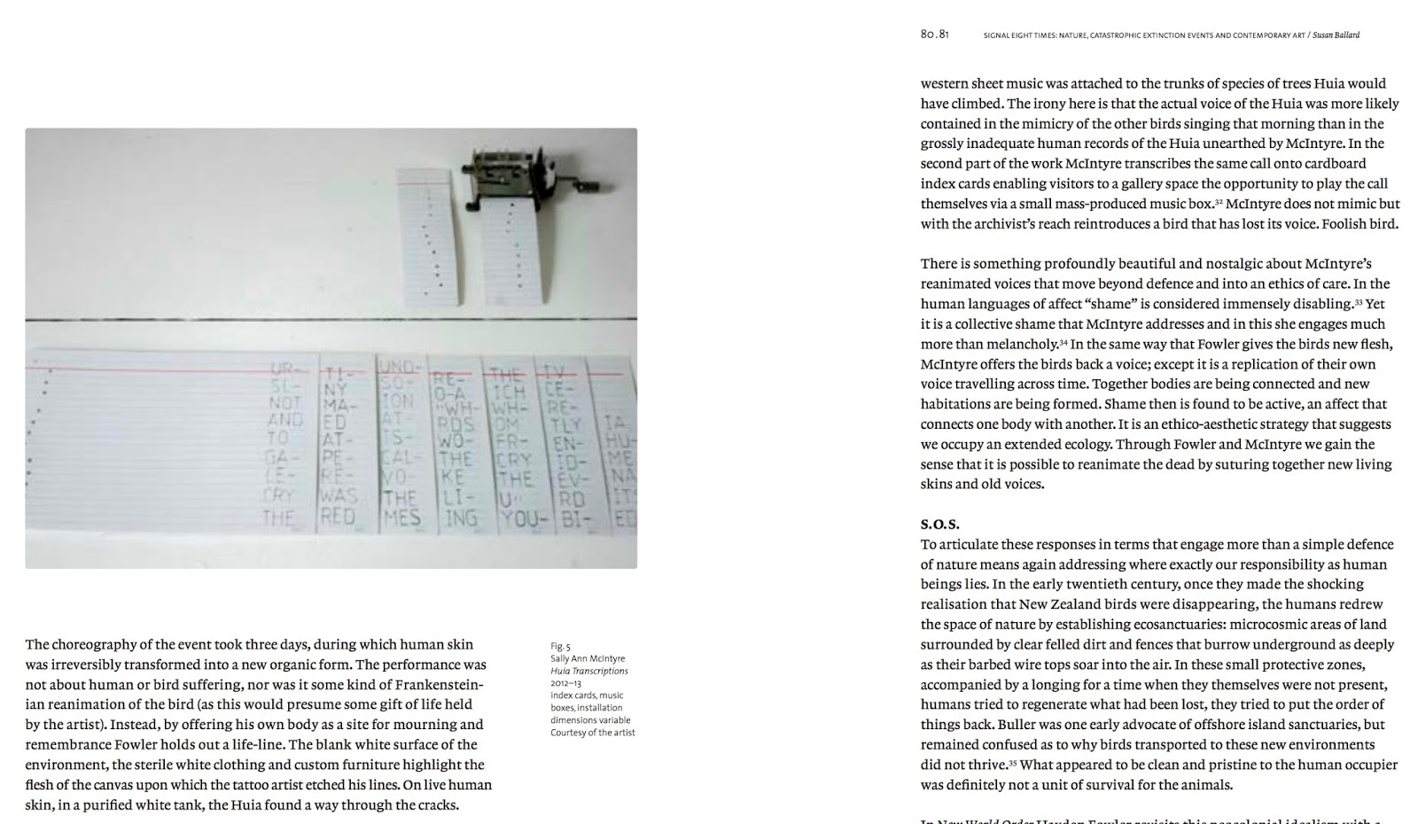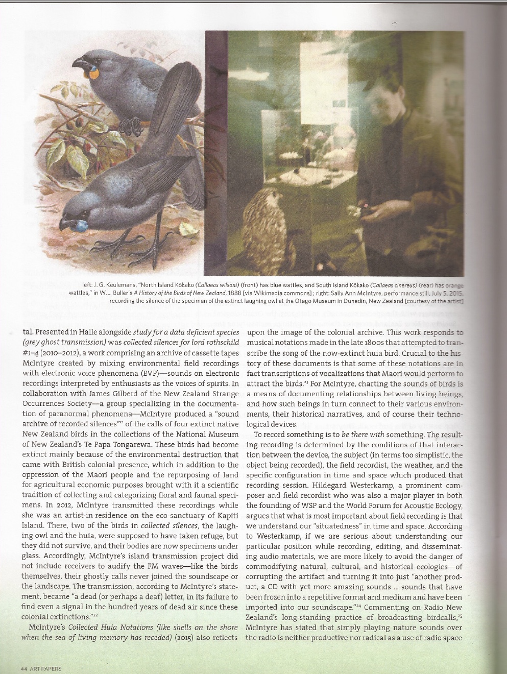 Within the wider scope of her discussion, Su weaves two of my projects into this latest version of the paper, pairing their focus on the sketchy musical notations of colonial-era pakeha contact with vanished birds still extant in contemporary archives, and the silence which remains in the present of museums, with other artists and works. She writes: "I argue that in staging small moments of encounter, which remind us that our experience of the environment is intimately tied to the survival of ideas, contemporary works of art can help us think about extinction anew."