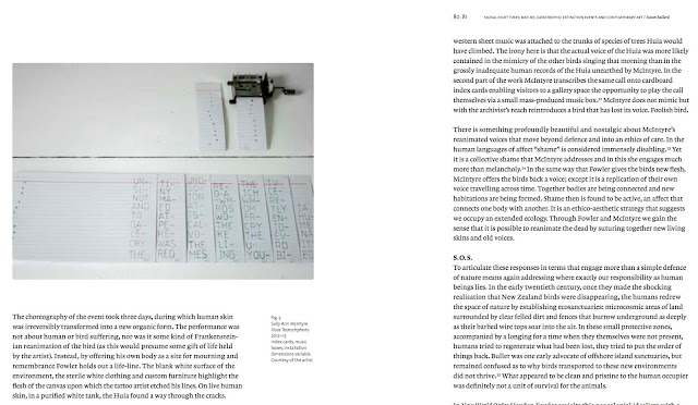 Within the wider scope of her discussion, Su weaves two of my projects into this latest version of the paper, pairing their focus on the sketchy musical notations of colonial-era pakeha contact with vanished birds still extant in contemporary archives, and the silence which remains in the present of museums, with other artists and works. She writes: "I argue that in staging small moments of encounter, which remind us that our experience of the environment is intimately tied to the survival of ideas, contemporary works of art can help us think about extinction anew."Su's essay can be read and downloaded in full at this link
