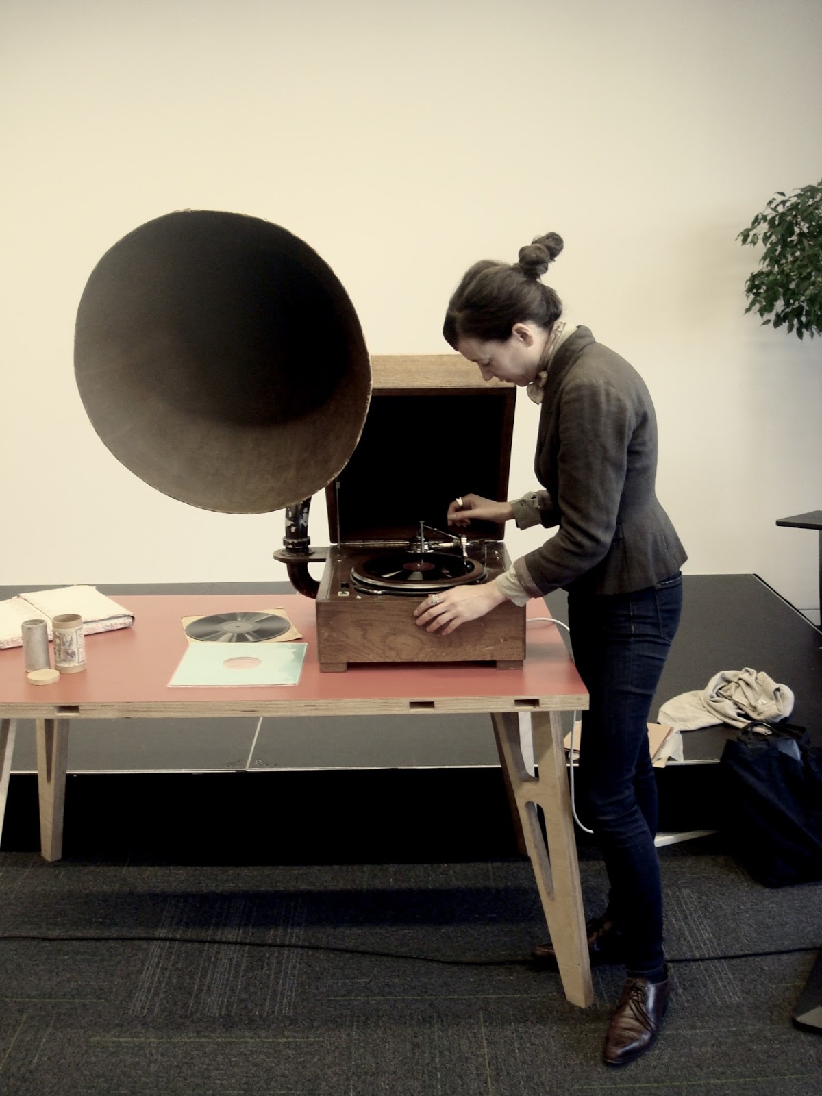 taking a somewhat baroque approach to this ideal opportunity to explore the theme of non-electric amplification, I brought a Columbia Graphophone Cylinder Phonograph (a very special Model Type AA, c.1901-1902, the "smallest talking machine" sold by Columbia; it plays 2 minute cylinders, and is all original including the horn) all the way from New Zealand.