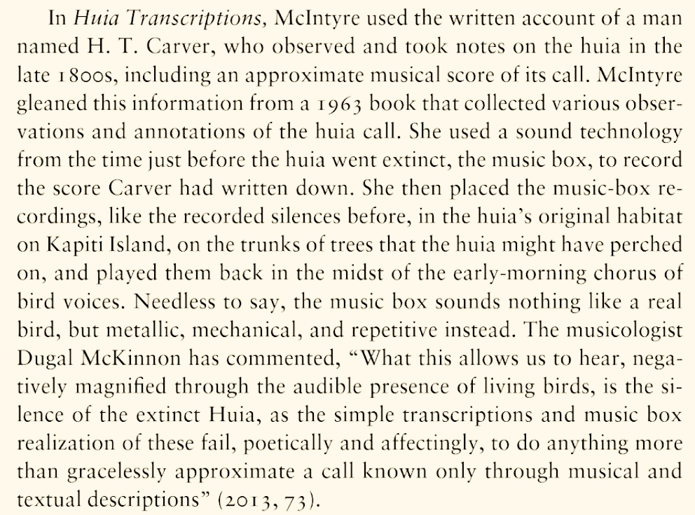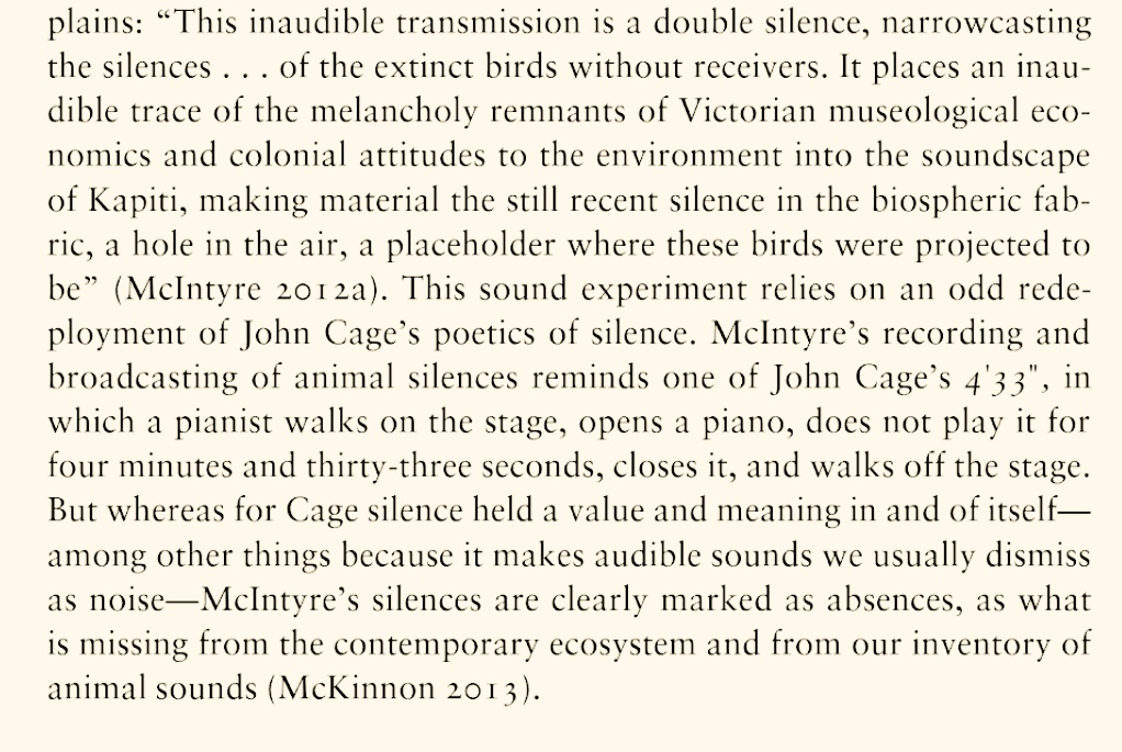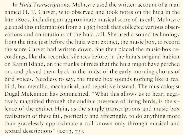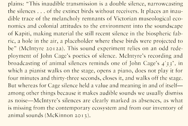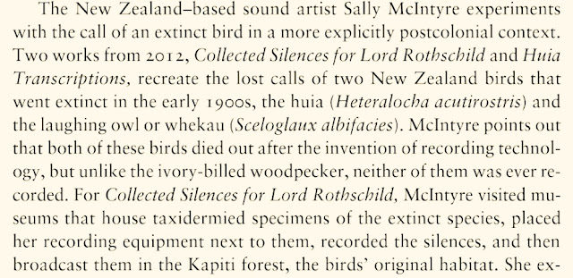 Discussion of two works "Huia Transcriptions" and "Collected Silences for Lord Rothschild", exploring extinction, silence and silencing in the postcolonial environment, and the subject of cultural mourning of the nonhuman, are included by Heise. It's an absolute honor to be represented in this context, and I thank Ursula for seeing how these works might speak in their own small ways to an important and necessary wider discussion, alongside so many other thinkers, writers and artists whose work I value so greatly.