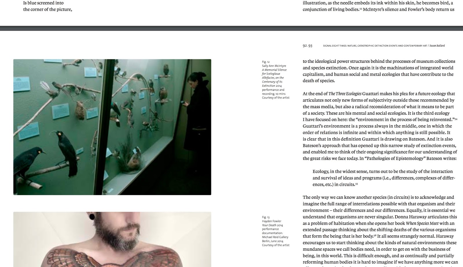 since (at least) 2014 Su has been writing in erudite and localised manner about Australian and New Zealand artists who take the extinction of nonhuman creatures as a theme. An early version of the paper, which she presented at the conference Affective Habitus: New Environmental Histories of Botany, Zoology and Emotions, was called More than the simple defence of nature: Artists confront extinction. In her blog, Su writes of this paper that "the title comes from a passage in Guattari’s Three Ecologies where he highlights how humans are part of nature, they are ‘in’ nature, so cannot defend it. He says more needs to be done if we are to survive IWC (Integrated World Capitalism). I talk about some NZ and AU artists who have been thinking about NZ bird extinctions, and suggest that they are already doing ‘more’. These art works are not a defence at all but a reenactment of environments."